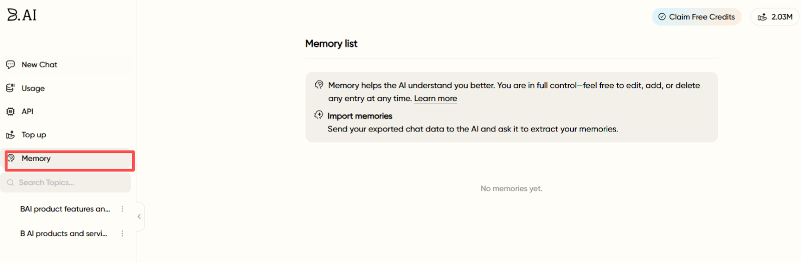 Furthermore, the B.AI LLM Service also offers a Memory function, which can automatically learn and retain the user's interaction context to more accurately understand their needs. Users can access the memory bank at any time to edit, add, or delete any entries, ensuring information accuracy and privacy control.