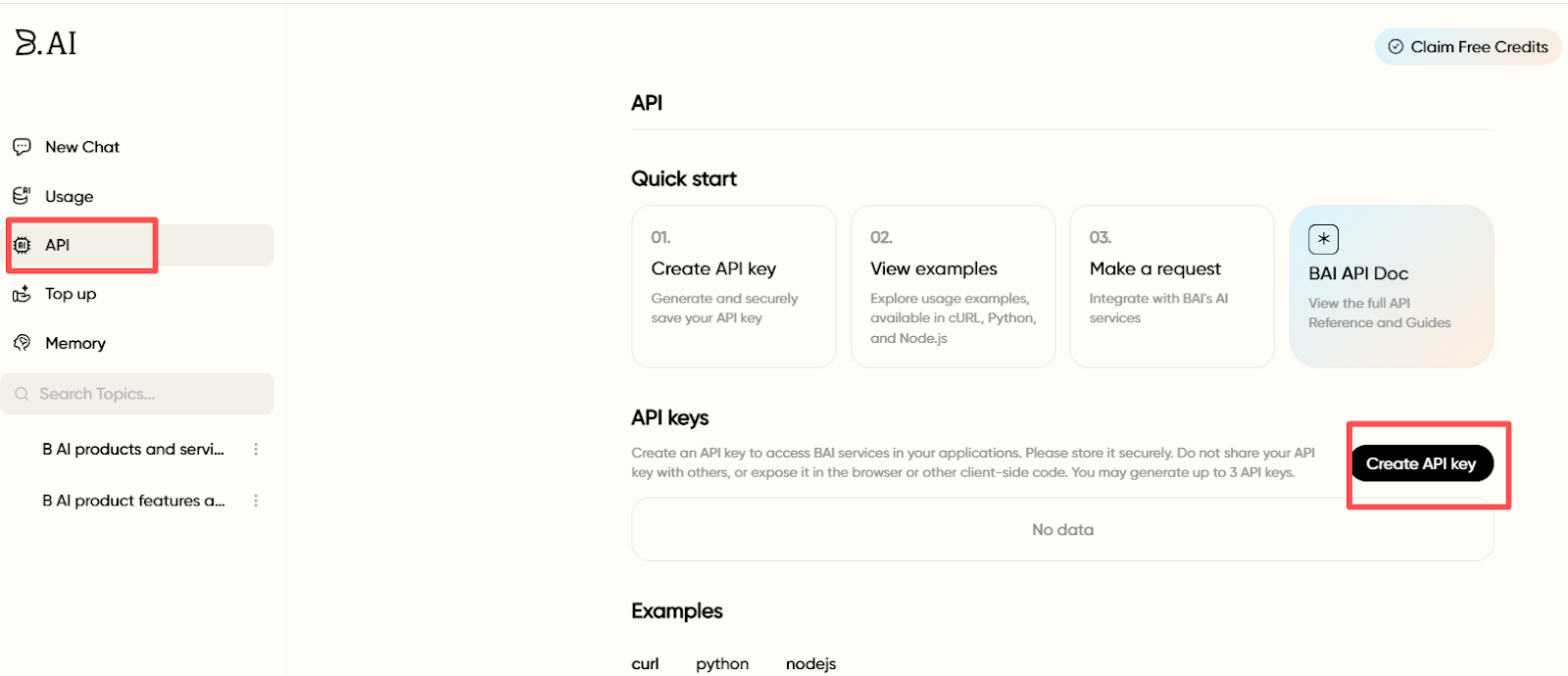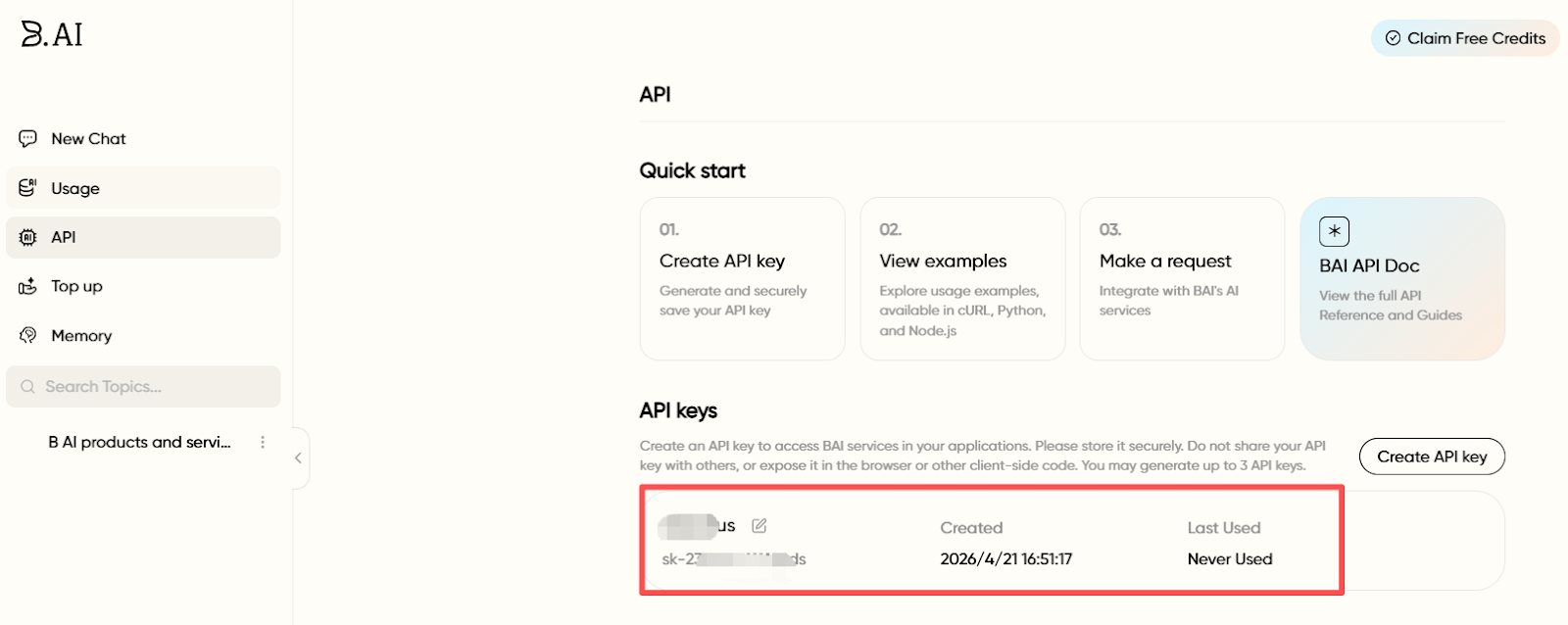 The specific steps are: In the "API" management interface in the left menu bar of the B.AI LLM Service page, click the "Create API Key" button. The system will generate a unique API Key. Then, this API Key can be filled into the API configuration file of AI Agents (such as OpenClaw, Claude Code, Cursor, etc.) to achieve one-stop invocation of LLM Service APIs.