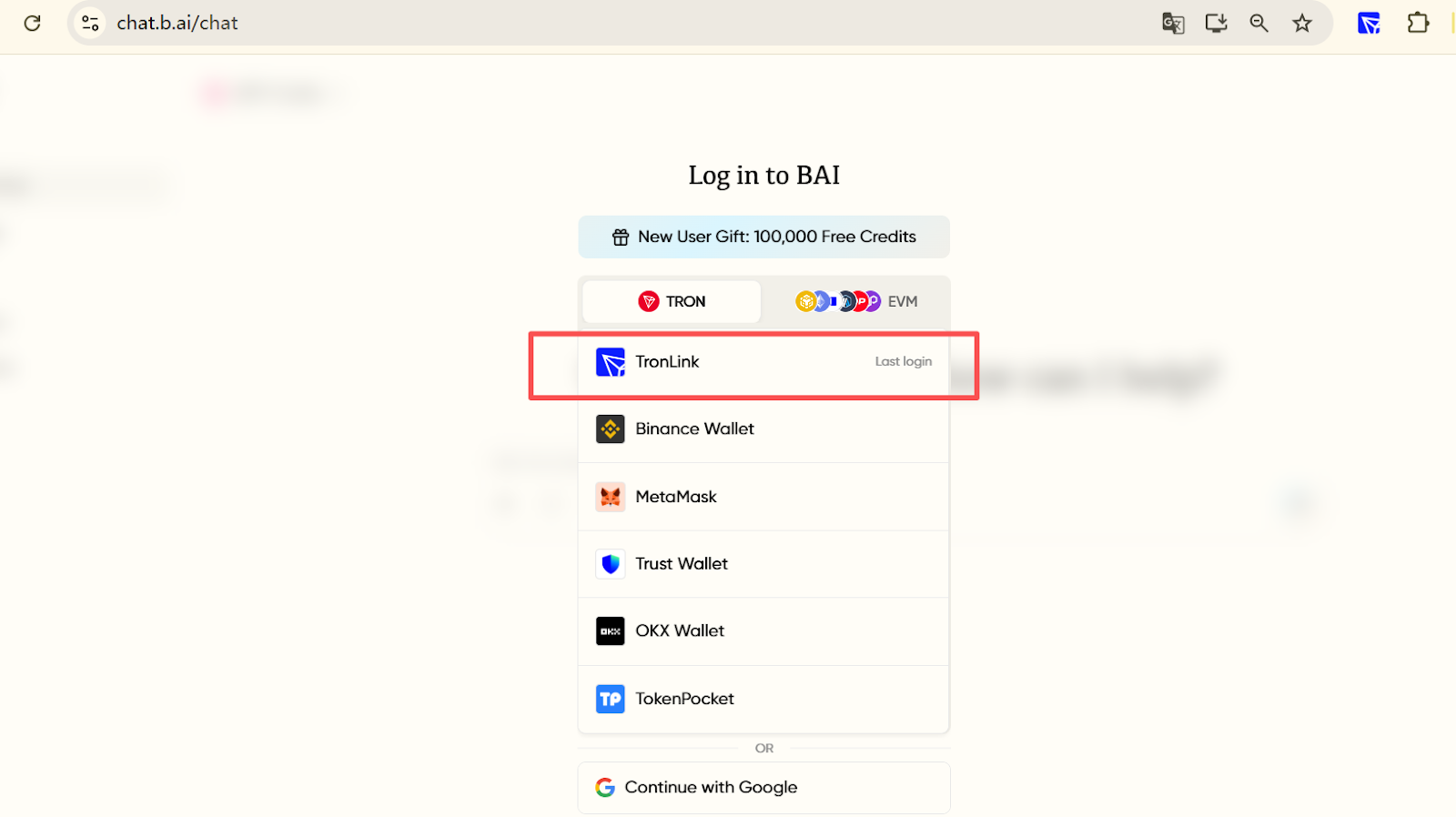 B.AI LLM Service currently supports the TRON network and several major EVM-compatible chains (such as BNBChain, Ethereum, Base, Arbitrum, Polygon, Optimism, etc.). Users can use crypto wallets like TronLink, Binance Wallet, MetaMask, TrustWallet, OKX Wallet, and TokenPocket for one-click authorization and anonymous login.