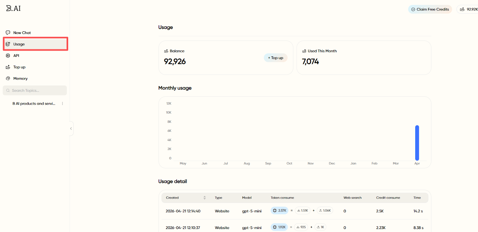 For detailed credit usage, users can view their account balance and the consumption details of each interaction at any time on the "Usage" page in the left menu bar.