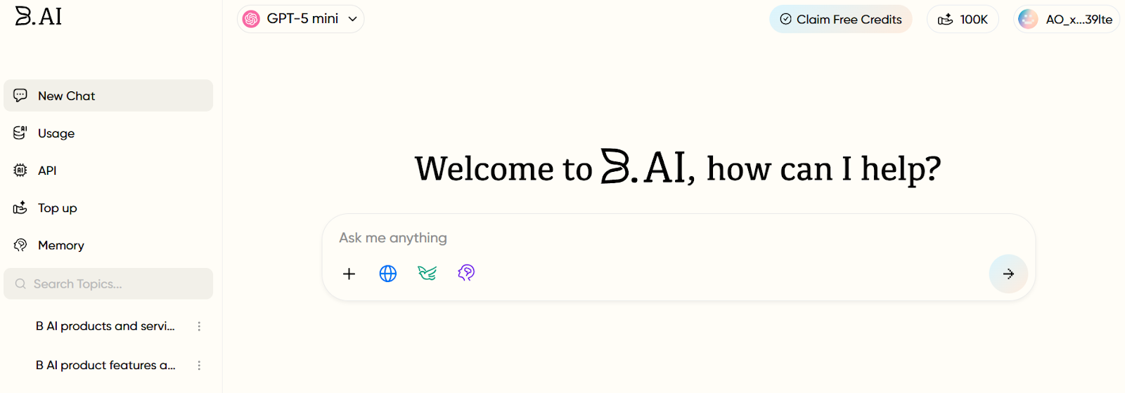B.AI supports dual login methods: Web3 wallet and Web2 social account. First-time users can claim 100,000 free AI credits with zero门槛 (entry barrier). These credits are universally applicable for dialogues and API calls across all AI models on the platform.