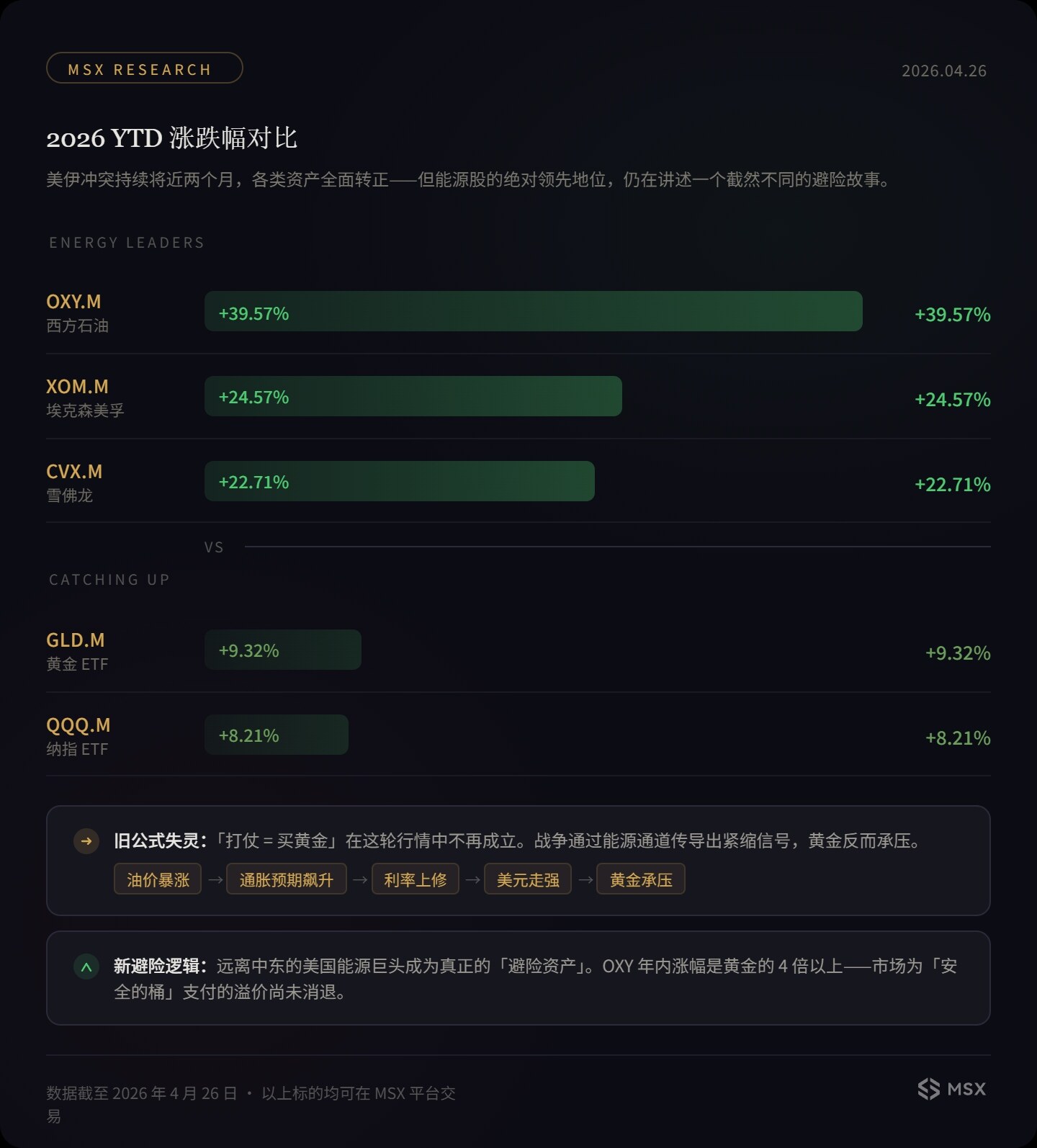 - As of April 26, OXY was up about 40% year-to-date, while the NASDAQ ETF and gold ETF returned close to 8-9%, confirming energy stocks as the best performers in this round of conflict.