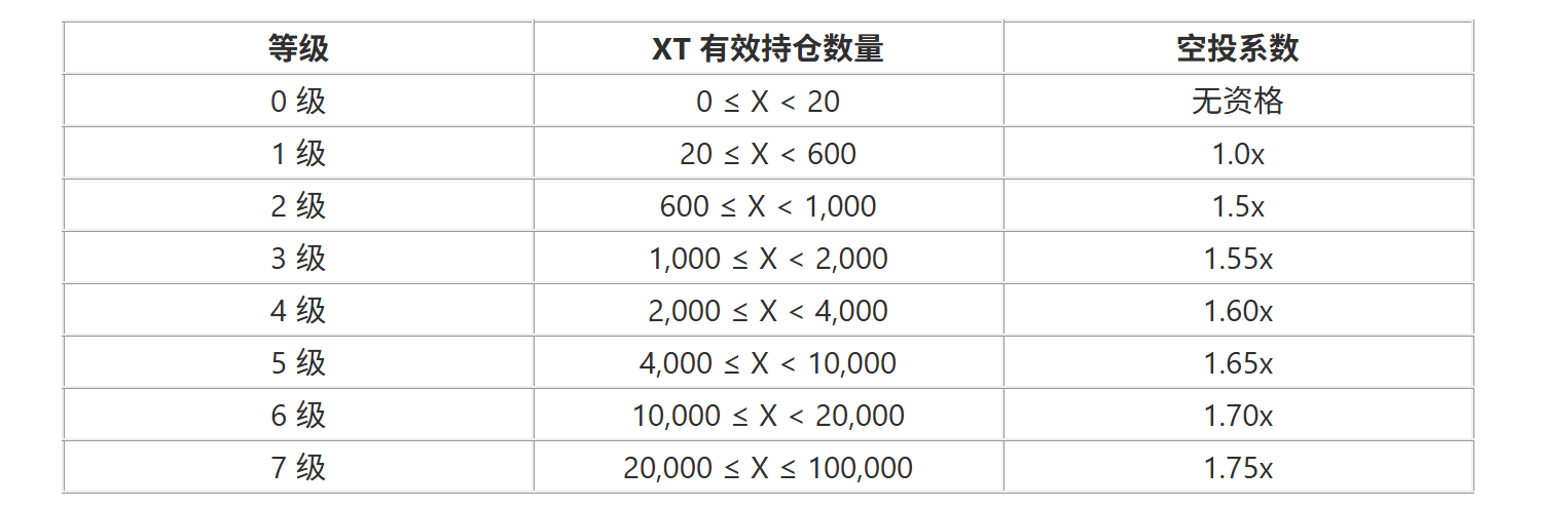 XTエアドロップには7つのレベルがあり、それぞれエアドロップ係数が異なります。保有量とレベルが高ければ高いほど、エアドロップ係数も高くなり、最終的に受け取れるエアドロップ報酬も増えます。