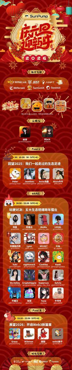 このイベントは、TRONエコシステムの5つの主要コミュニティが参加する3時間にわたる大晦日の合同イベントです。主催者と業界のKOLが、市場の変動に左右されず、皆様がリラックスしてくつろげるようお手伝いします。イベントは、年末総括、コミュニティチーム対抗ゲーム、そして新年の挨拶の3つの主要セグメントで構成されています。楽しいチャレンジやインタラクティブな抽選会も随所に盛り込まれ、豪華なUSDT賞品や限定版の共同ブランドグッズもご用意しています。