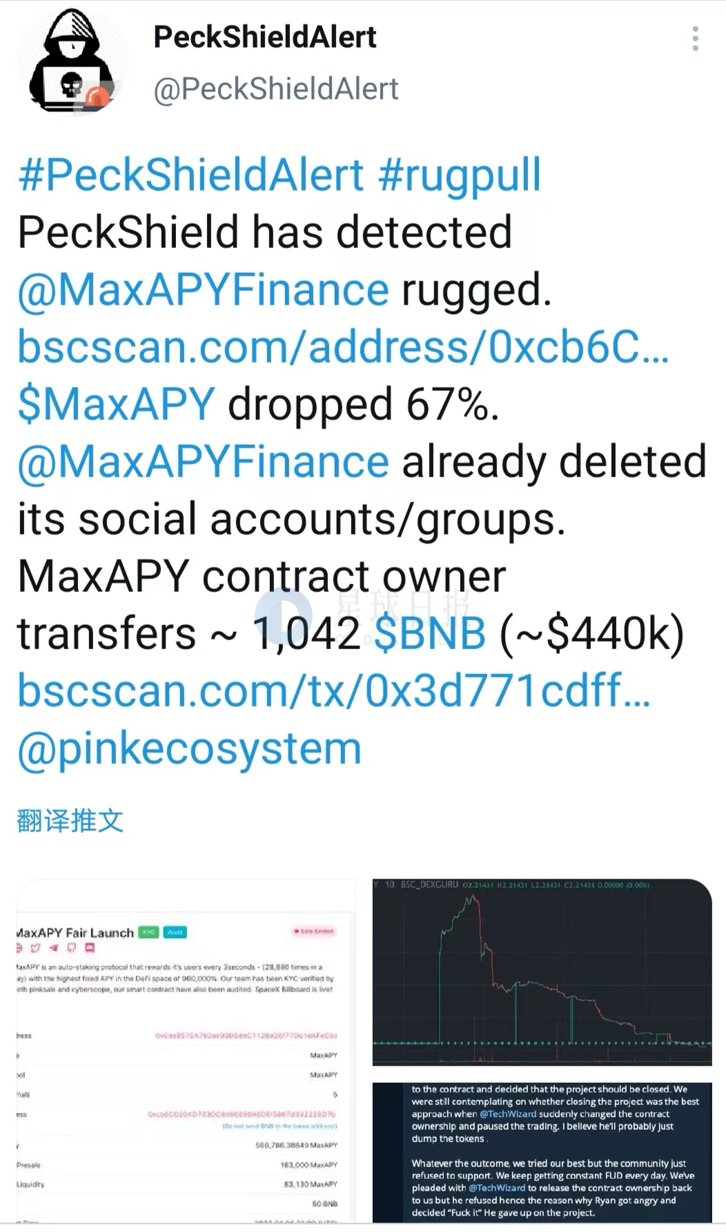 Chain上自动质押协议MaxAPY Finance发生Rug Pull,代币Metal短时下跌67%,目前已删除其官方Twitter帐户和