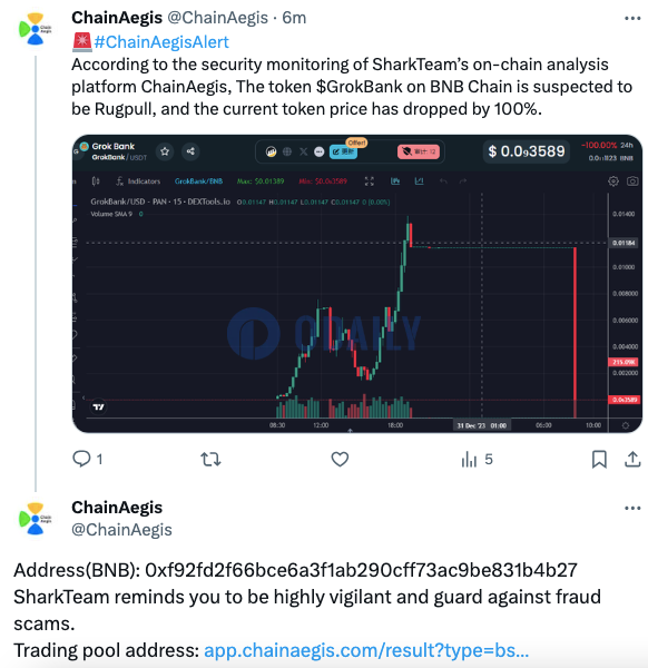 ChainAegis: BNB チェーン上の GrokBank トークンにはラグ プルがある疑いがある