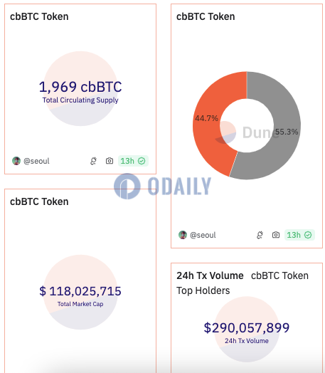 Odaily スタージャーナルによると Duneのデータによると、Coinbaseが発売したパッケージ化されたビットコインであるCoinbase Wrapped BTC(cbBTC)の流通供給量は1,969に達し、イーサリアムチェーンの55.3%、ベースチェーンの44.7%を占めている。 cbBTC の現在の市場価値は 1 億 2,000 万米ドル (1 億 1,802 万 5,715 米ドル) に近く、24 時間の取引高は 2 億 9,000 万米ドルを超えています。
