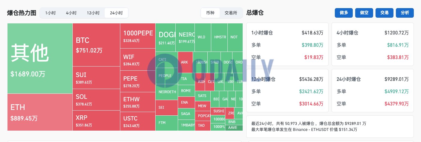 Odaily スタージャーナルによると Coinglassのデータによると、過去24時間にネットワーク全体で9,289万1,000ドルが清算され、そのうちロング注文は4,909万1,200ドル、ショート注文は4,379万9,000ドルが清算されました。