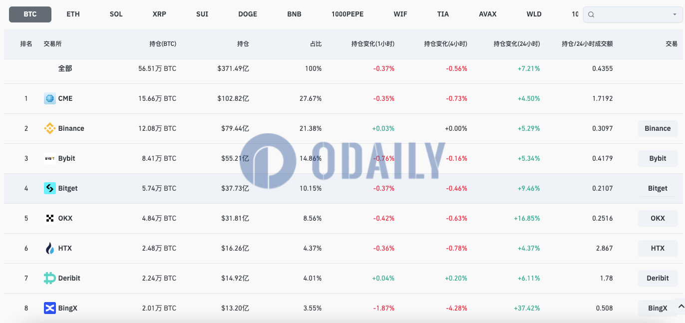 ネットワーク全体の BTC 契約のオープンポジションは 370 億米ドルを超え、24 時間で 7.21% 増加しました
