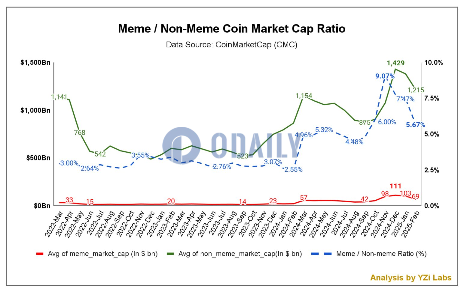 データによると、Memeコイン市場は2024年後半に急速に拡大し、2024年11月には時価総額が1,110億米ドルに達し、非Memeコイン市場の9%を占めました。しかし、市場心理が冷え込むにつれ、この比率は2025年初頭に7.5%に低下し、2月にはさらに5.67%に低下した。