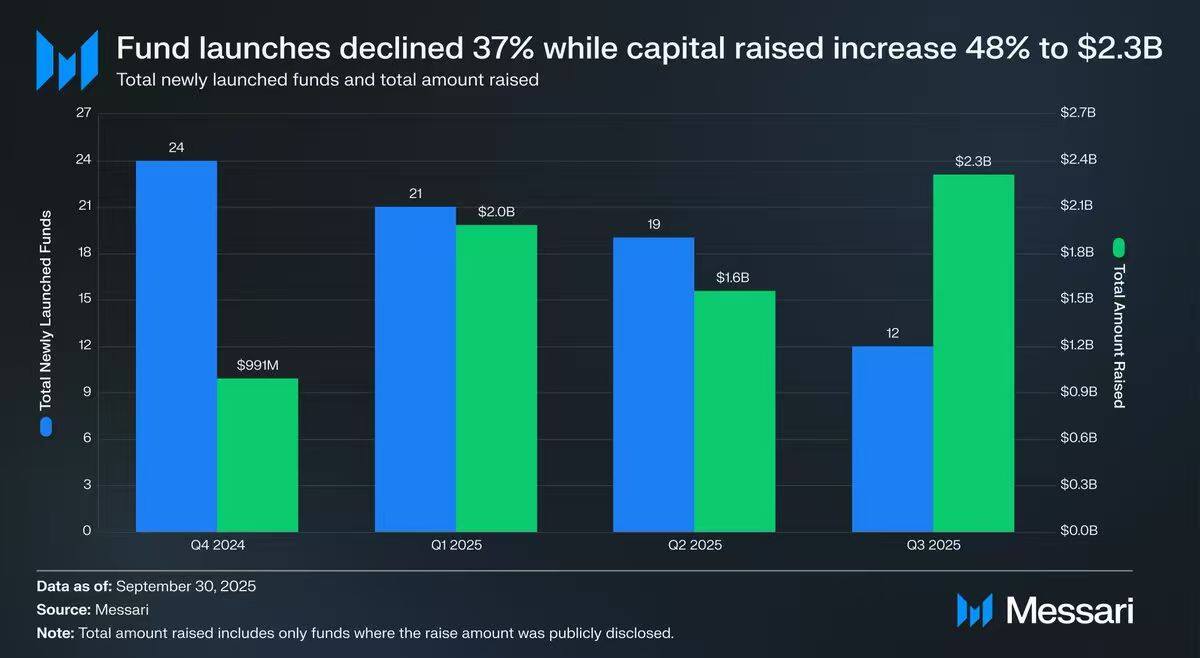 Odaily Planet Dailyによると、MessariのアナリストはXプラットフォームに記事を掲載し、2025年第3四半期に新規設立されたファンドの調達総額が前月比48%増の23億1,000万米ドルに達したと報告しました。これには以下の内容が含まれます。