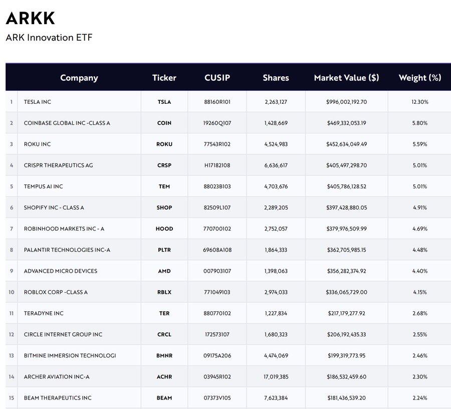 Odaily Planet Dailyによると、キャシー・ウッド氏のARKK ETFは保有上位15銘柄を公開しており、その中にはテスラ(12.3%)、コインベース(5.8%)、ROKU(5.59%)、CRISPR(5.01%)、Tempus AI(5.01%)、Shopify(4.91%)、ロビンフッド(4.69%)、パランティア(4.48%)、AMD(4.4%)、ロブロックス(4.15%)、テラダイン(2.68%)、サークル(2.55%)、ビットマイン(2.46%)、アーチャー・アビエーション(2.3%)、ビーム・セラピューティクス(2.24%)など、複数の仮想通貨関連企業が含まれている。