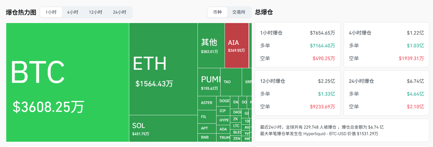Odaily Planet Dailyが報じたCoinglassのデータによれば、過去1時間でネットワーク全体で合計7,654万6,000ドルのポジションが清算され、そのうち7,164万4,000ドルがロングポジション、490万2,500ドルがショートポジションだった。