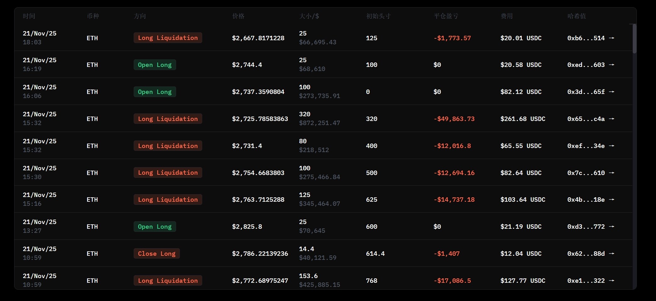オンチェーンモニタリングによると、ETH価格が2,700ドルを下回ったため、Machi Big Brotherのロングポジションは再び清算されました。25ETHを失った後、現在彼が保有するロングポジションは100ETHのみで、保有額は270,000ドル、清算価格は2,655ドルとなっています。