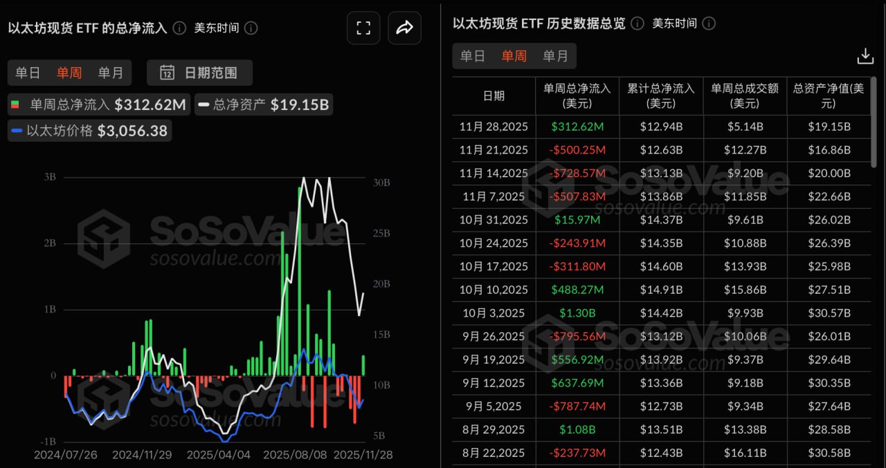 SoSoValueのデータによると、先週(11月24日から11月28日、東部時間)、イーサリアムスポットETFには3億1,300万ドルの純流入があった。
