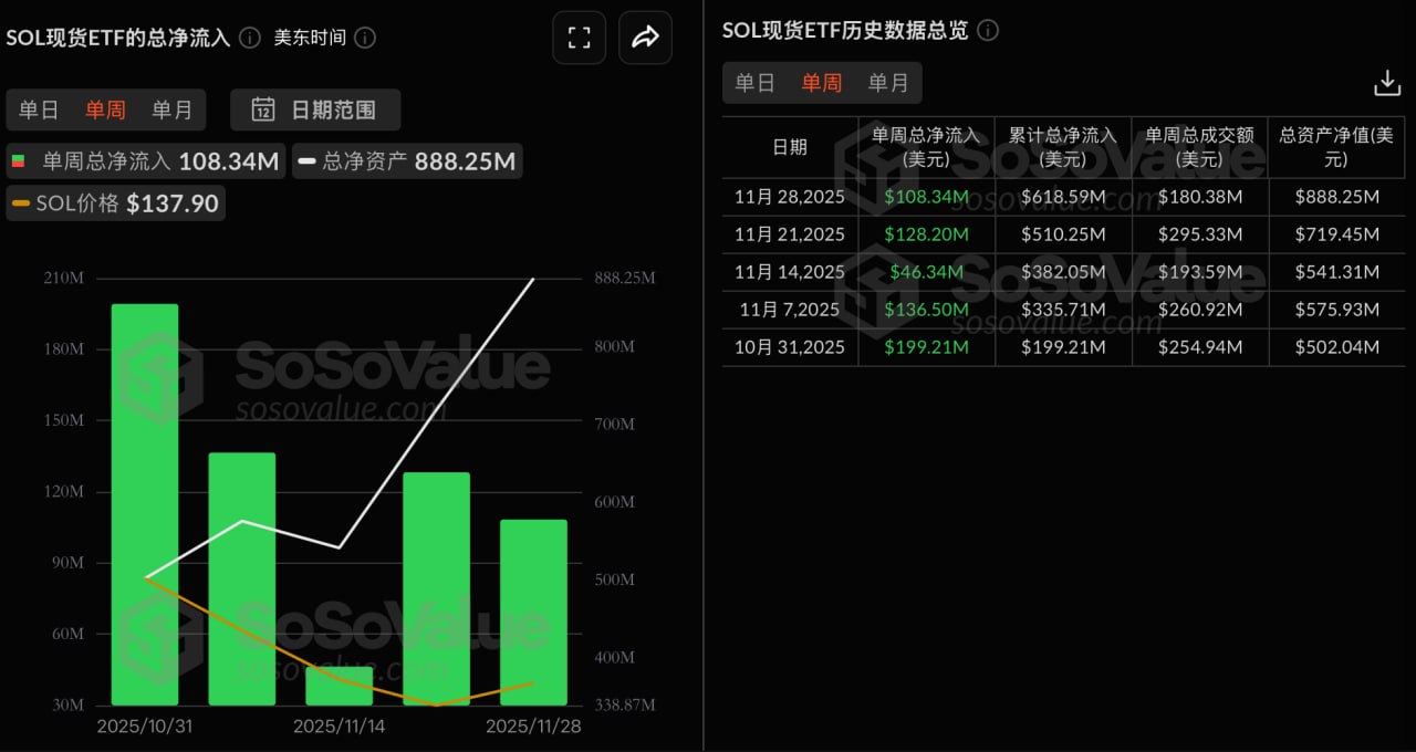SoSoValueのデータによると、SOLスポットETFは先週(11月24日から11月28日、東部時間)に1億800万ドルの純流入を記録した。