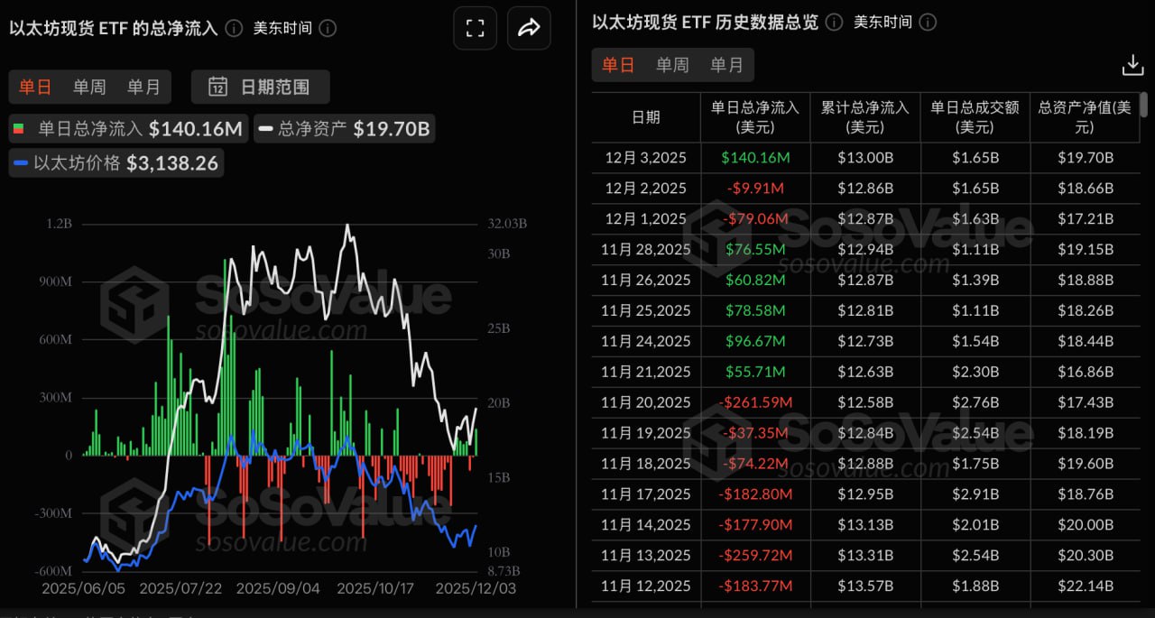 SoSoValueのデータによると、イーサリアムスポットETFには昨日(12月3日、東部時間)、1億4000万ドルの純流入が見られました。
