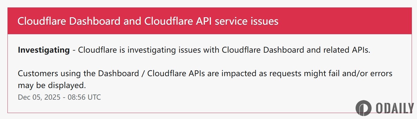 公式筋によると、Cloudflareはコントロールパネルと関連APIに関する問題を調査中とのことだ。(Odaily Planet Daily)