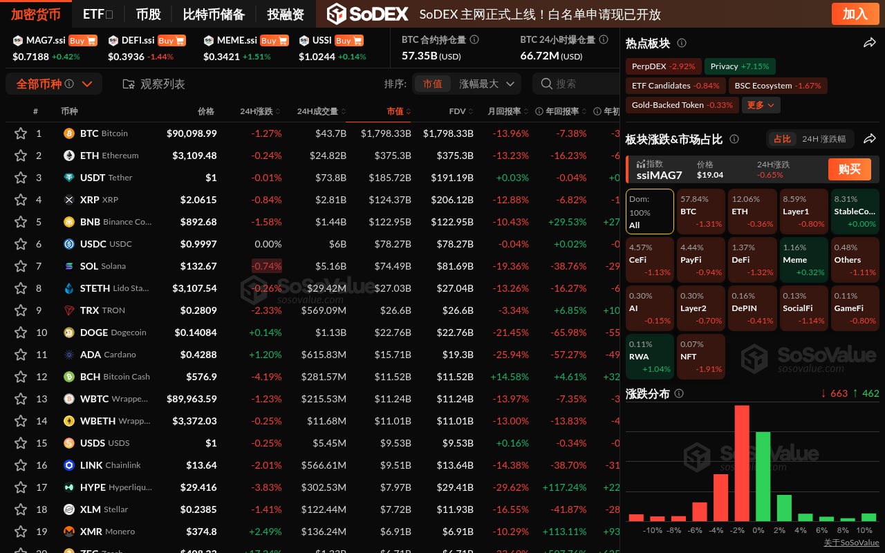 Odaily Planet Dailyが12月9日に報じたところによると、SoSoValueのデータによると、仮想通貨市場全体が下落傾向にあり、ビットコイン(BTC)は1.31%下落して約9万ドルとなった。イーサリアム(ETH)は0.36%下落して3,100ドルとなった。RWAセクターとMemeセクターのみが比較的堅調に推移し、それぞれ1.04%と0.32%の上昇となった。RWAセクターでは、Ondo Finance(ONDO)とCreditcoin(CTC)がそれぞれ2.91%と6.30%上昇し、Plume(PLUME)はCoinbaseへの上場などの要因により8.35%急上昇した。Memeセクターでは、Pepe(PEPE)とFLOKIがそれぞれ3.78%と5.29%上昇した。
