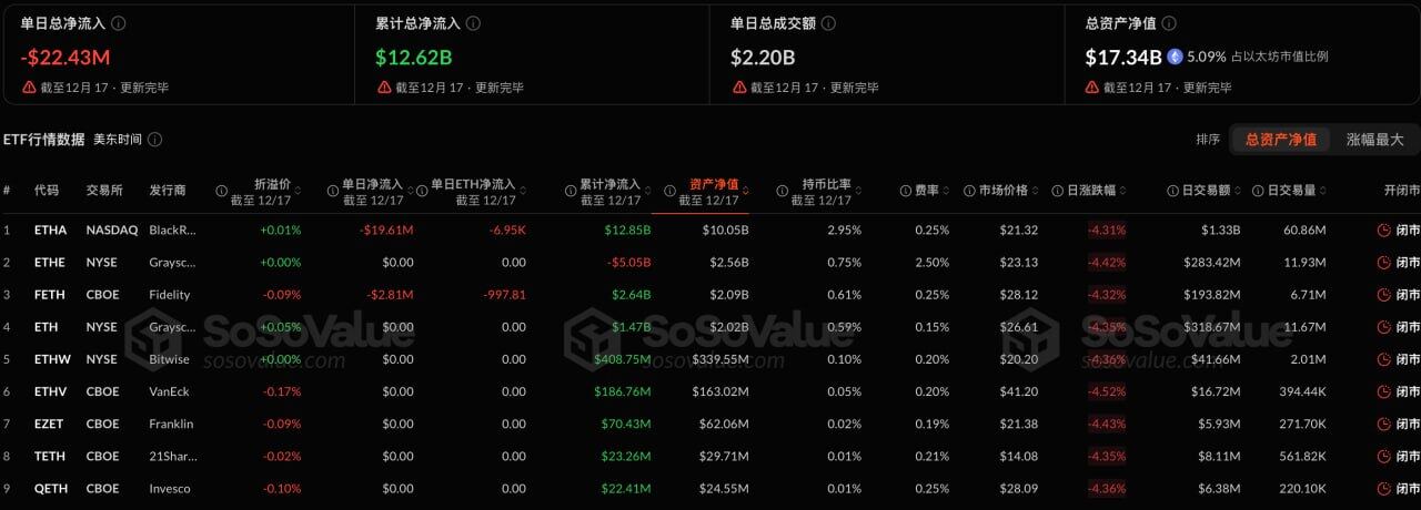 Odaily Planet Dailyが報じたSoSoValueのデータによると、イーサリアムスポットETFは昨日(12月17日、東部時間)、2,242万6,400ドルの純流出を記録した。