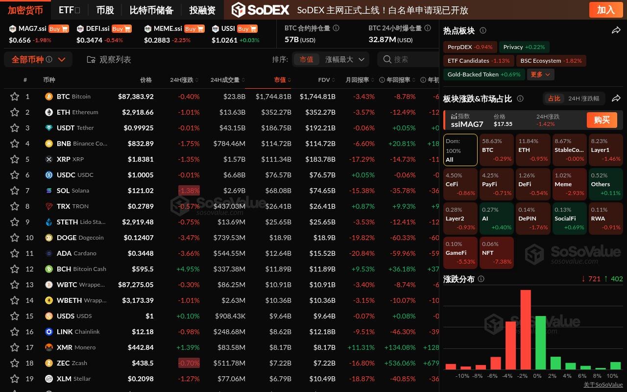 仮想通貨セクターの過去のパフォーマンスを反映する指数では、ssiSocialFiが0.26%上昇したのに対し、ssiMemeとssiDeFiの指数はそれぞれ3.23%と0.74%下落した。
