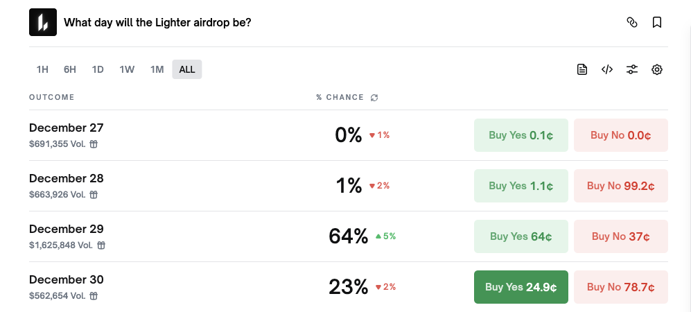 Odaily Planet Dailyによると、Polymarketで予測された「Lighterが12月29日にエアドロップされる」という確率は、12月25日のピーク時の87%から64%に低下しました。一方、「Lighterが12月30日にエアドロップされる」という確率は、本日13.3%から24%へと異常に上昇しました。
