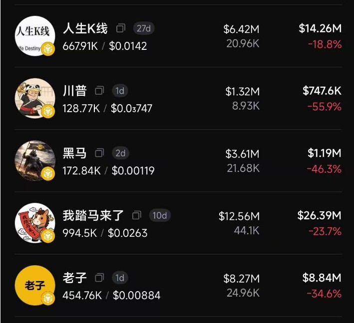 BNBチェーン上の一部の中国語ミームトークンが下落、「老子」は6時間で34.6%下落