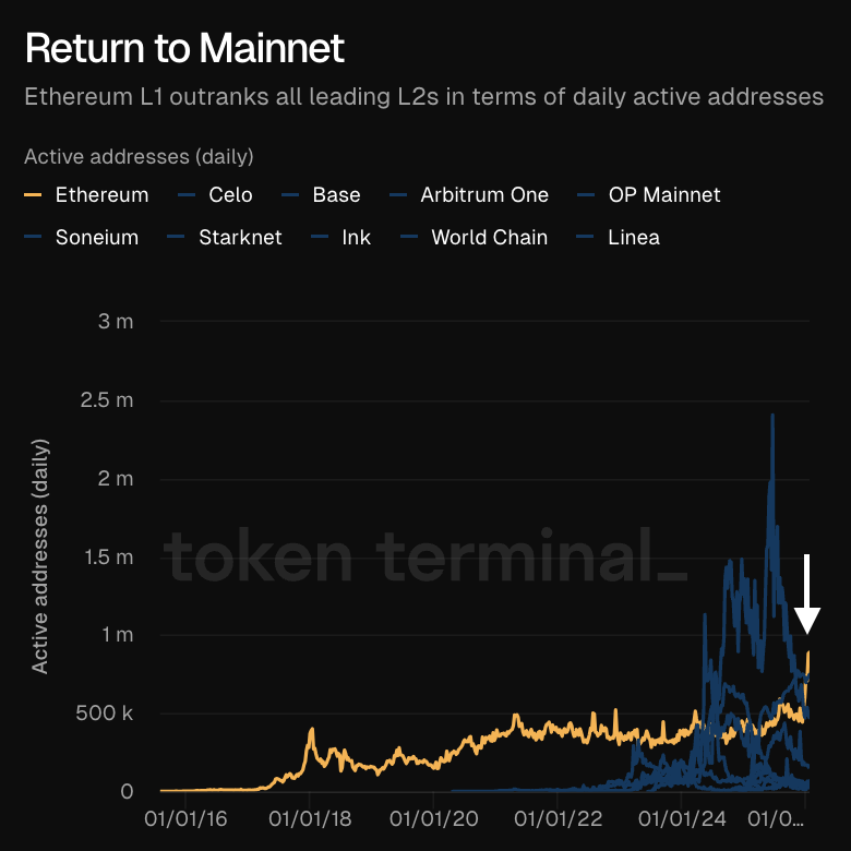 Token Terminal:イーサリアムメインネットの日次アクティブアドレス数がすべてのLayer2を上回る