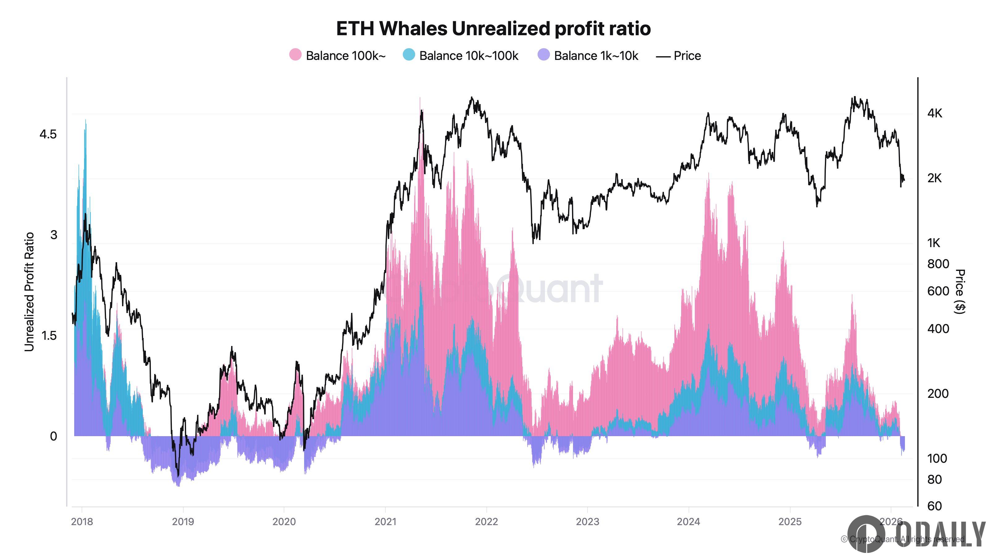 OdailyのアナリストDarkfostがXプラットフォームで投稿し、現在すべてのレベルのETHクジラの未実現利益率がマイナスに転じていると述べた: