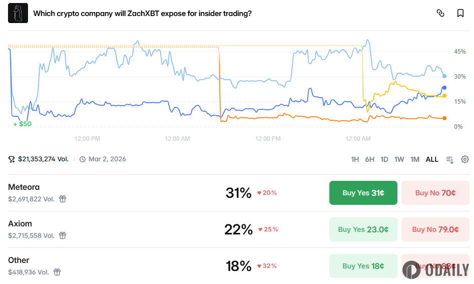 Odailyの報道によると、Polymarketのウェブサイトデータが示すところでは、「ZachXBTがどの企業のインサイダー取引を暴露するか」というイベントにおいて、Axiomの確率が今朝の最低8.3%から22%に上昇し、Meteora(確率31%)に接近している。さらに、このイベントの取引量はすでに2100万ドルを突破した。