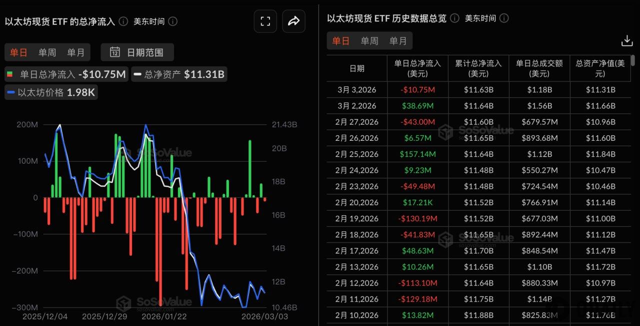 Odailyの報道によると、SoSoValueのデータでは、昨日(米国東部時間3月3日)のイーサリアム現物ETFの総純流出額は1075万2900ドルでした。