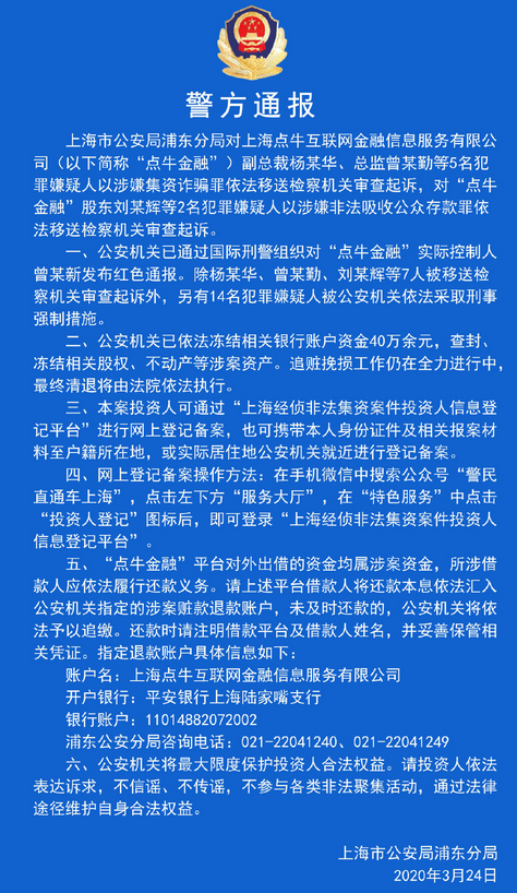 2019年7月21日、Dianniu Financeが突然移転したと報告し、連絡が取れなくなった疑いがあるとのこと。そして10月24日、上海浦東公安局は、2019年7月31日、典牛金融が捜査のために公的預金を不法に吸い上げた疑いがあり、事件に関与した刑事容疑者17人に刑事強制措置をとったと発表した。