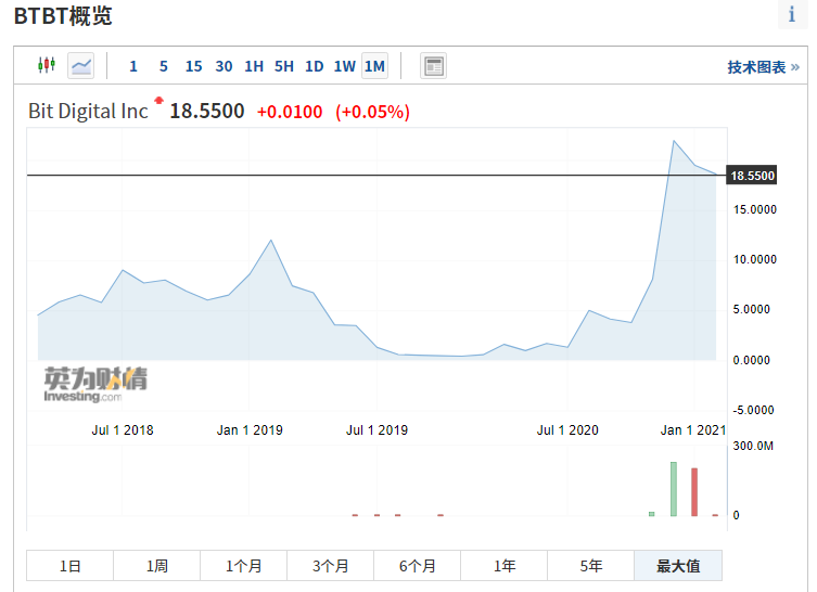 情報によると、Bit Digital は約 17,996 台のマイニング マシン (すべて Antminers または Shenma マイニング マシン) を購入しました。このニュースを受けて同社の株価は上昇を続け、2020年初めから年末までにBTBTの株価は1,800%以上上昇した。