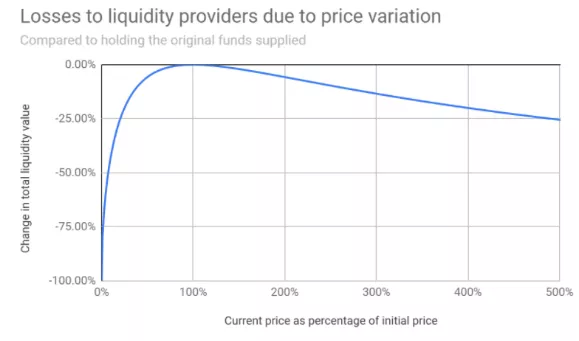 (強気市場では、LP の通貨が 5 倍に上昇しても、AMM に参加しない場合と比較して損失は 25% にすぎません。しかし、弱気市場では、LP の損失は指数関数的に増加します)