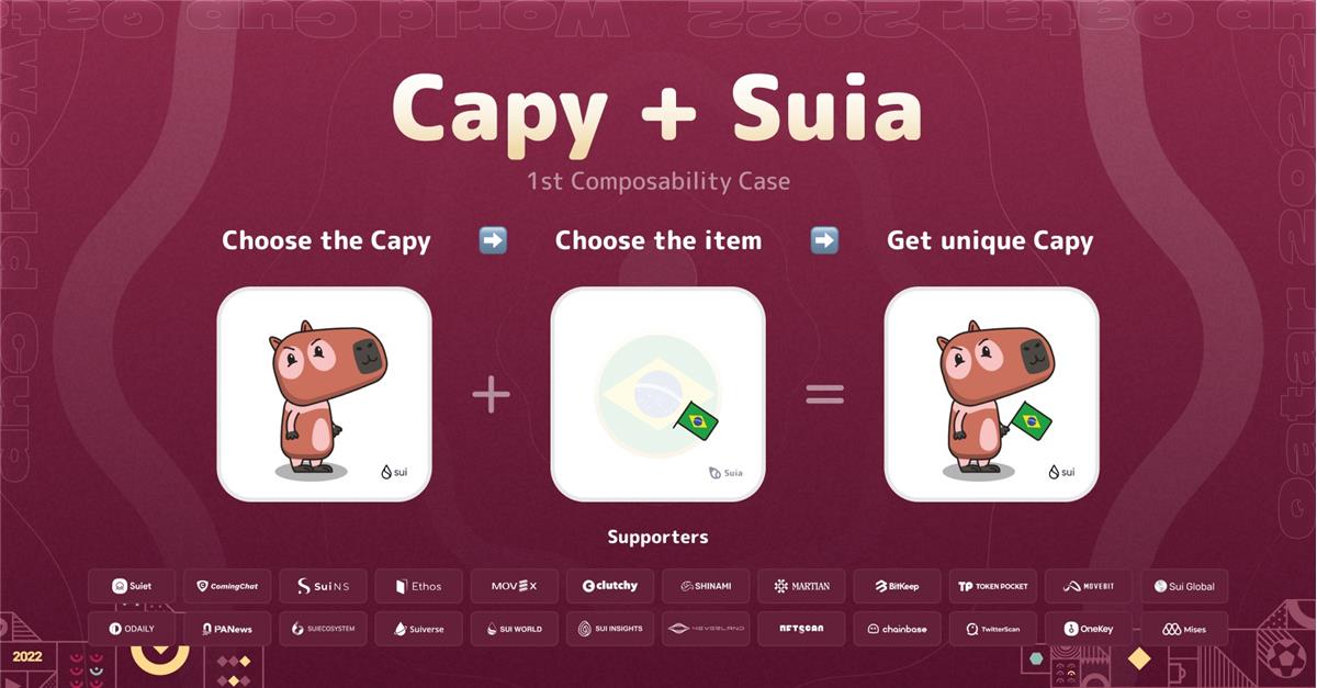 さらに、Suiaは昨年12月のワールドカップ予想イベントなど、多くの興味深い機能を公開しており、SuiaコミュニティユーザーはチームNFTを受け取ることでチームへの支持を表明できます。このイベントの注目すべき点の 1 つは、以下の画像に示すように、Sui のオブジェクト指向プログラミング モデルのおかげで、Suia のワールド カップ NFT が Capy NFT と効果的に組み合わされていることです。