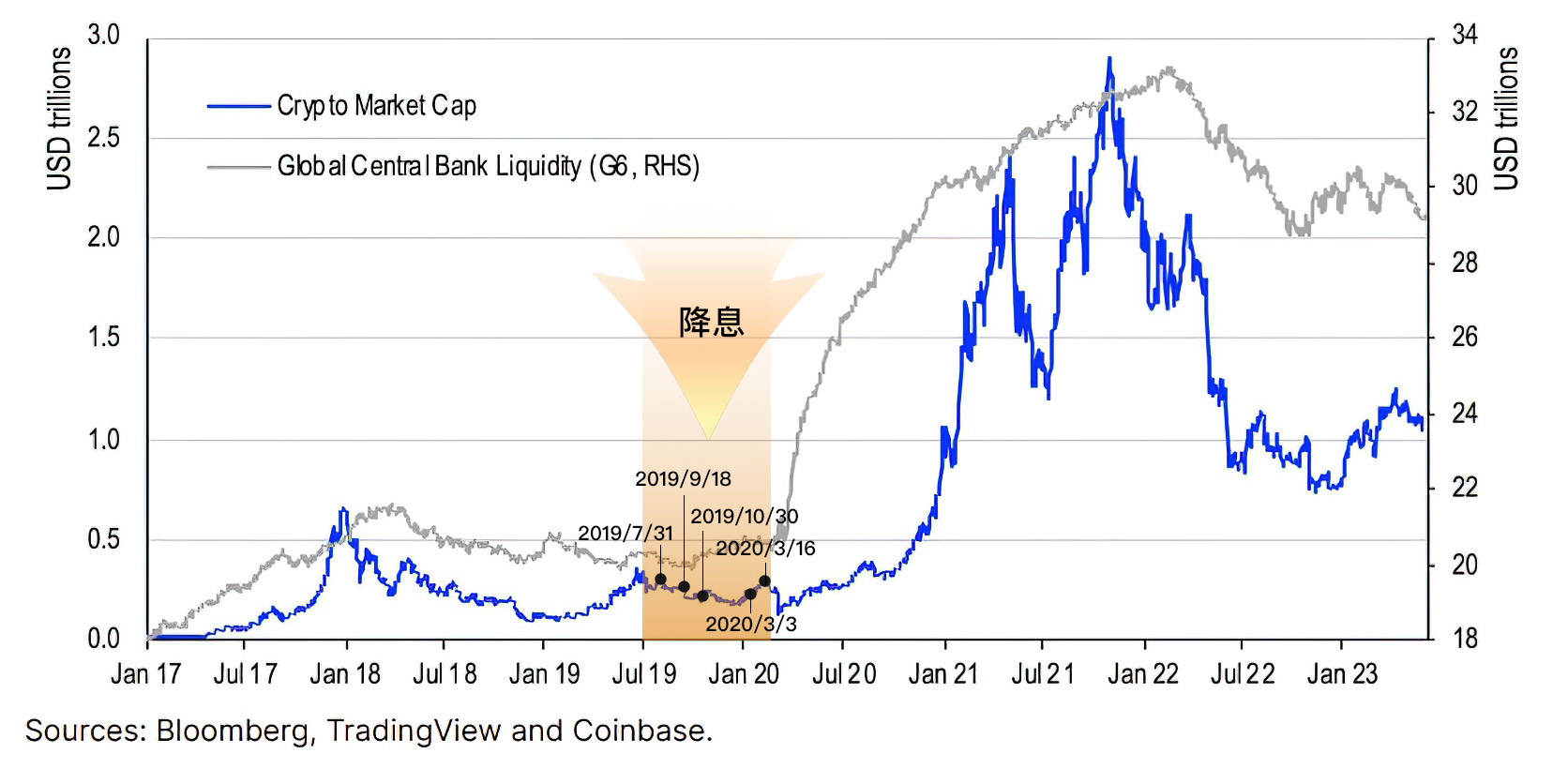 過去のビットコイン強気相場と弱気相場を見ると、マクロ流動性がビットコイン価格に重要な影響を与えていることがわかります。具体的には、2012 年のビットコイン強気相場は連邦準備理事会による第 3 弾量的緩和の実施と欧州中央銀行の緩和政策を背景に発生し、2016 年の強気相場は英国の EU 離脱に関連し、さらなる放出を目的として債券購入プログラムが開始されました。流動性。同時に、ビットコイン先物の開始により大量の市場外資金が市場に流入し、2020年の強気市場は世界的な疫病の影響を受け、米国は無制限の金融緩和を含む大規模な金融緩和政策を採用した。量的緩和とは、市場に大量の流動性を注入することです。これによりビットコインなどの暗号通貨市場への大量の資金流入が生じ、ビットコインの価格が上昇した。逆に、弱気相場は通常、世界的な流動性の逼迫と同時に起こります。 2014年、2018年、2022年の弱気市場では、世界的な流動性不足によりビットコイン市場から資金が流出し、ビットコイン価格が下落した。