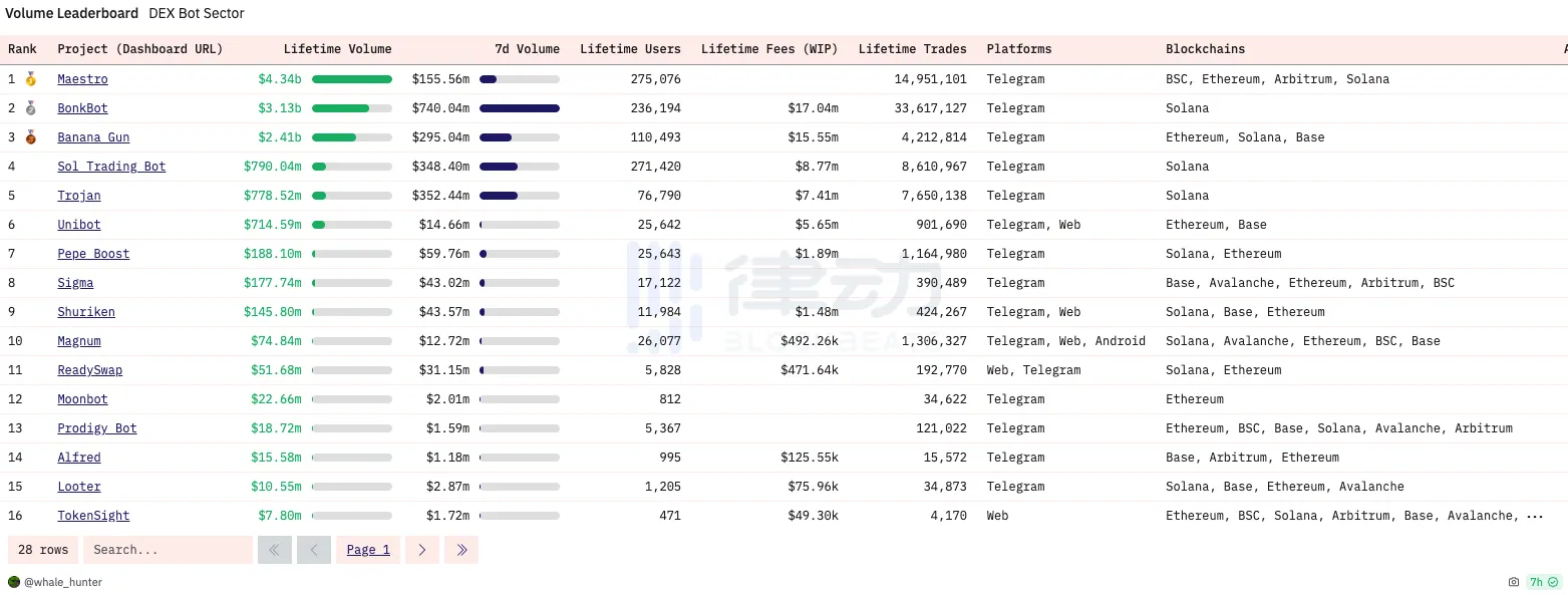 によると@whale_hunter集計されたデータによると、過去 7 日間の取引高トップ 6 は、BonkBot、Trojan、Sol Trading Bot、Banana Gun、Maestro、Pepe Boost です。