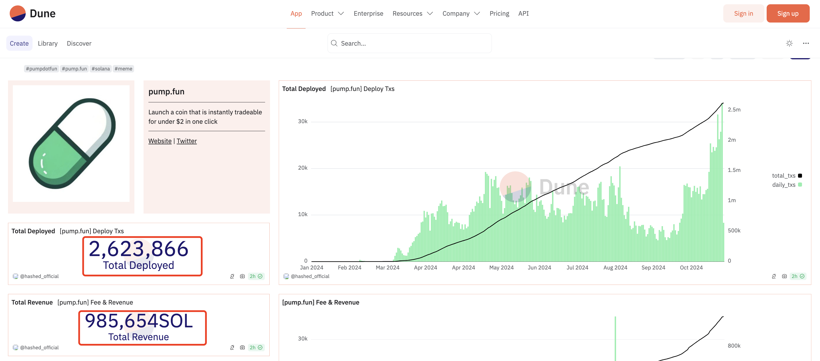 10 月 23 日の時点で、 Dune データによると、pump.fun プラットフォームの関連稼働データは次のとおりです。