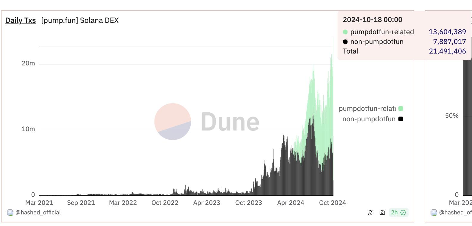 10月18日時点で、SolanaエコロジーDEXチェーンの総トランザクション操作数は2149万1000回で、このうちpump.fun関連操作は1360万4000回に達し、約63.3%を占めた。