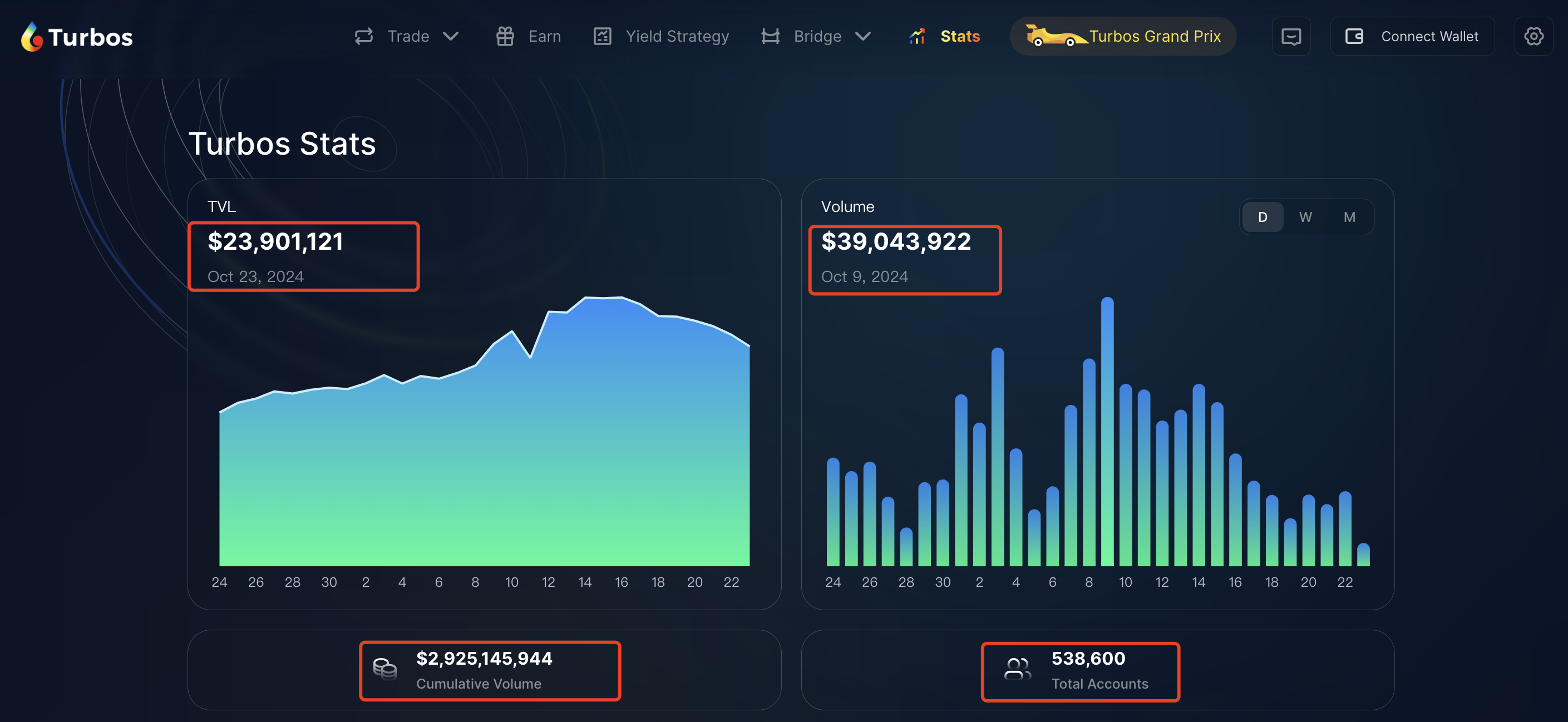 公式ウェブサイトによると、10月9日には1日の取引高が3900万米ドルを超え、 10月14日には過去最高を記録、TVLは3000万米ドルを超え、総口座数は40万を超え、累計取引高は28億を超えた。米ドル; 最新のデータによると、TVL は約 2,390 万米ドルで安定しています。一連の優れた市場パフォーマンスのおかげで、同社のプラットフォームトークンTURBOS(ターボス・ファイナンス)は10月12日に1日で15.7%の上昇を記録した。