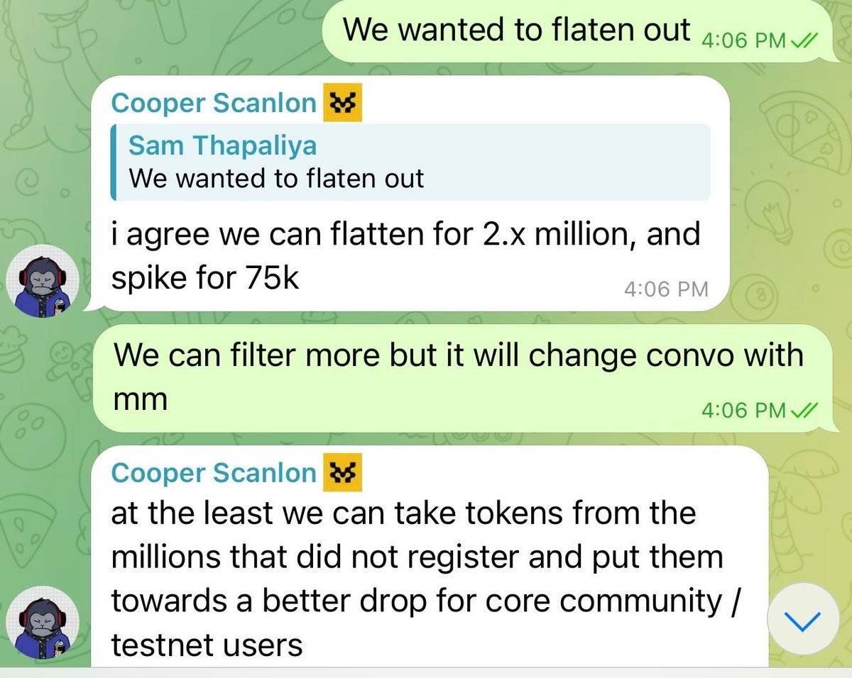 データセットには多くの問題があったため、私はクーパー氏に、報酬をエアドロップ参加者全員に均等に分配することを提案しました。しかし、この間、クーパー氏は、選ばれた75,000のウォレットグループがウォレットあたりのトークン割り当ての最高割合を受け取ることを主張した。