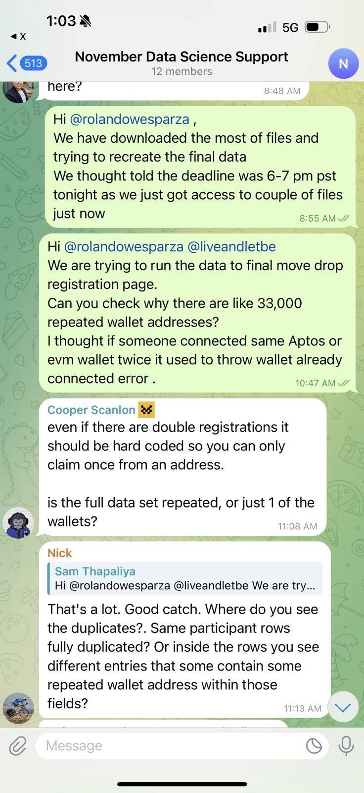 Movement チームは、自分たちが頼りにしていたデータセットが実際のテストネットの使用状況を正確に反映していないことに気づいたため、Cooper は私に、テストネットの使用状況に基づいてエアドロップ データセットを監査するデータ サイエンス チームを見つけるよう指示しました。