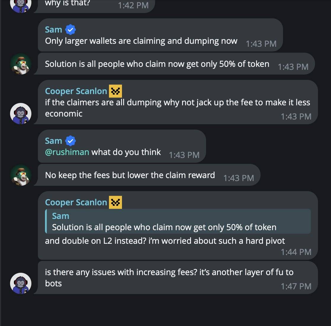 請求プロセス中に、これら 75,000 個のウォレットに問題があることに気づいたとき、私は再度、シビル攻撃 (偽アカウント) によるバンドルと販売の影響を減らすために報酬を償却することを提案しました。しかし、クーパー氏は請求手数料を上げることを選択したため、この75,000ウォレット以外のユーザーはほとんどエアドロップ報酬を請求できなくなりました。