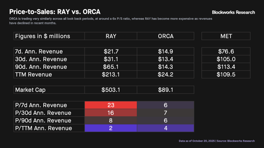 以下の表は、RAYとORCAの株価売上高倍率(PSR)を様々な調査期間にわたって比較したものです。ORCAは全ての年換算期間においてほぼ同様の取引状況を示しており、PSRは約6倍です。一方、RAYは売上高の減少に伴い、ここ数ヶ月で株価が上昇しています。Meteoraについては、調査期間によって異なりますが、年換算売上高は約7,500万ドルから約1億1,500万ドルの範囲と見込まれます。