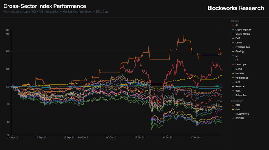 月足チャートを見ると、短期的には上昇が見られるものの、ほぼすべての仮想通貨指数は過去30日間で下落していることがわかります。10月10日の清算イベントをきっかけに、広範囲にわたる下落が見られ、堅調なのは金、仮想通貨マイナー、AI、株価指数のみでした。