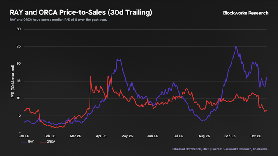 バリュエーションに関しては、レイディウムとオルカを比較対象とすることができます。下のグラフは、30日年率データに基づくレイディウムとオルカの年初来株価売上高倍率(P/S)を示しています。両資産は9月までは比較的近い水準で推移していましたが、その後レイディウムがプレミアムで取引されるようになりました。より広い視点で見ると、2025年における両資産のP/S倍率の中央値は9倍です。