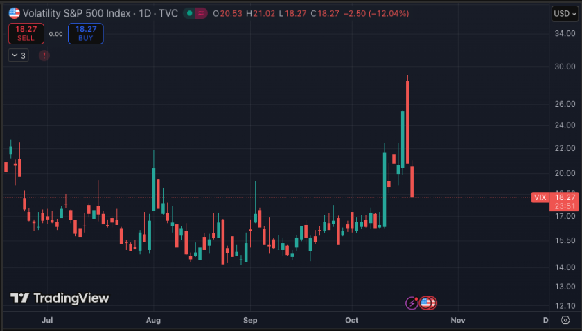 VIX指数は大幅に低下し、金曜日の朝に29まで急上昇した後、現在は18で取引されています。S&P500とナスダックは月曜日の取引で上昇し、過去最高値に迫る水準で取引を終えました。