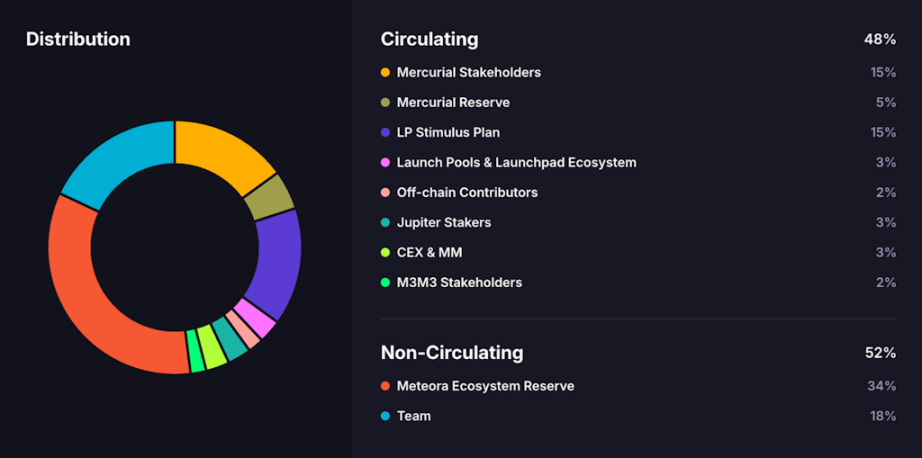2023年にチームは、METトークンの20%をTGEでMercurialのステークホルダーに配布すると発表しました。以下に示すように、チームは当初の約束を果たし、15%をMercurialのステークホルダーに、5%をMercurial Reserveに割り当てました。さらに、DEXは2024年1月31日からポイントプログラムを実施しており、これによりMETトークンの15%が割り当てられます。ローンチ時にはMET供給量の48%が流通しており、これはSolanaエコシステムにおける他の注目すべきトークンローンチと比較して高い割合です。