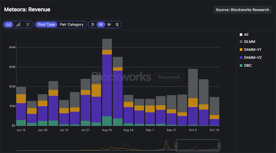 全体的な財務データを見ると、Meteoraは過去30日間で全プールを合わせて880万ドルの収益を生み出しており、オンチェーン活動が比較的低調な時期であっても、毎週150万ドル近くの収益を安定的に生み出しています。注目すべきは、Meteoraの収益の90%以上がMemecoinプールからのものであり、これらのプールは通常、SOL-ステーブルコイン、プロジェクトトークン、LST、ステーブルコイン-ステーブルコインプールよりも手数料が高いという点です。
