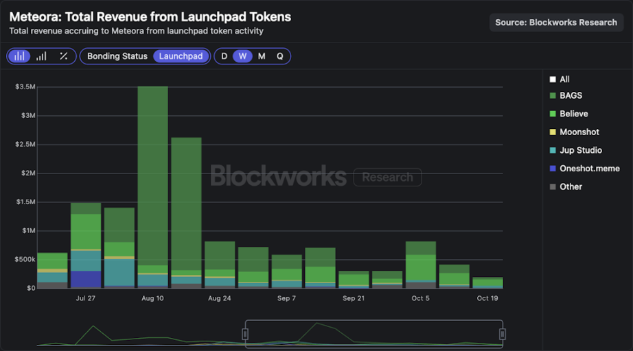 前述の通り、このDEXはJupiterチームと緊密に連携しており、Jupiterは個人投資家がオンチェーン取引を行うための人気のゲートウェイとなっています。さらに、Meteoraは2024年8月にMoonshotと提携してLaunchpadを立ち上げ、その後Believe、BAGS、Jup Studioといった新たなパートナーを獲得しています。下のグラフは、Launchpadの活動がここ数週間、Meteoraの週次収益に20万ドルから80万ドルをもたらしており、そのトラフィックの大部分はBelieveとBAGSからのものであることを示しています。